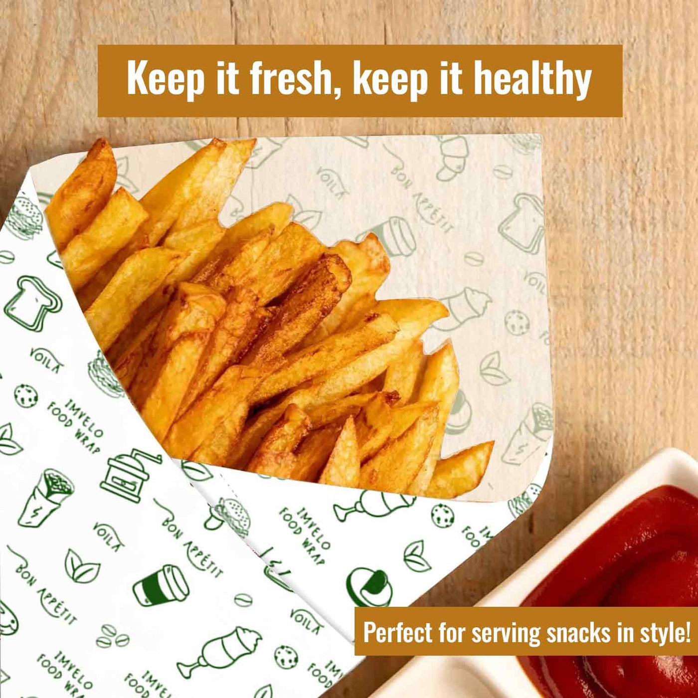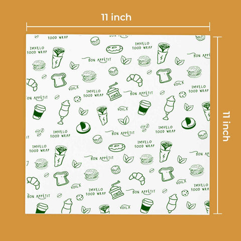 100 Pre-Cut Food Wrapping Paper Sheets – Includes 100 sheets of food wrapping paper, each 11 x 11 inches in size. Ready-to-use, no cutting needed—ideal for wrapping snacks, paratha, and more.